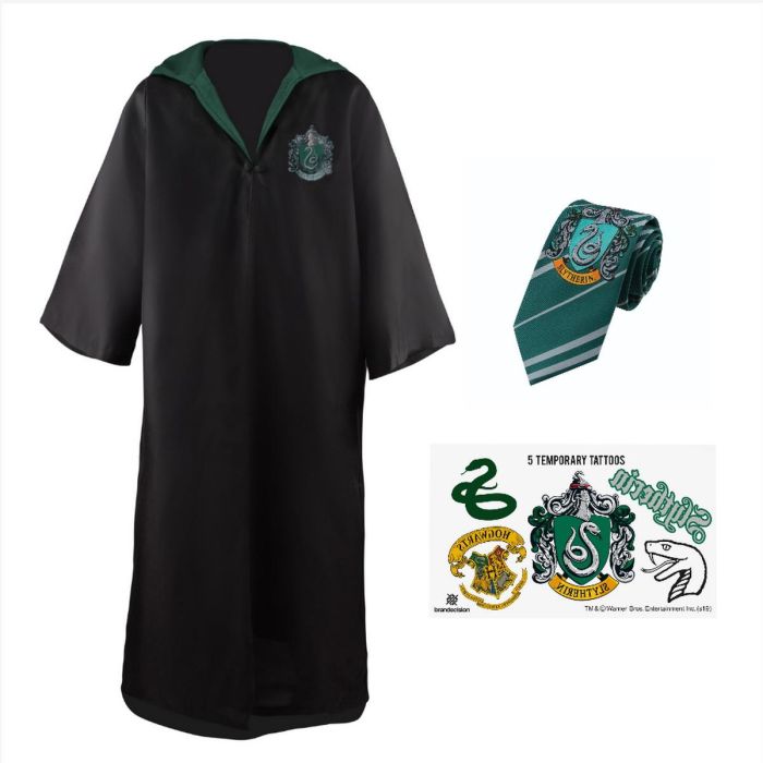 Kappan och slipsen är kopior på det som Slytherin-eleverna Draco Malfoy, Vincent Crabbe och Gregory Goyle bär under sina år på Hogwarts i Harry Potter-filmerna. Kappan är svart och grön medan slipsen är grön med gråa ränder. Slytherins vapensköld finns på båda.