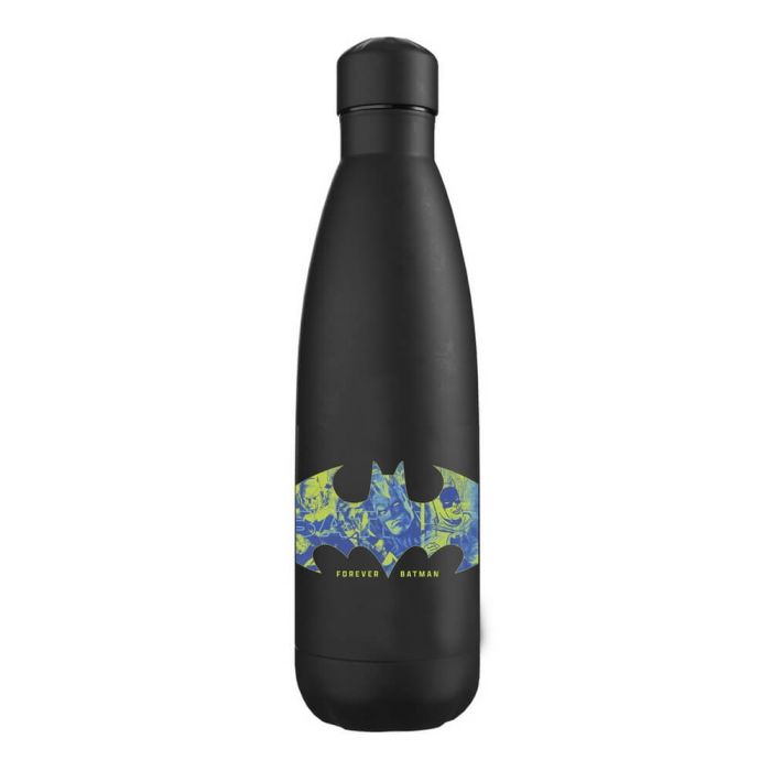 Svart, dubbelväggad flaska i rostfritt stål med som håller dryck kall i upp till 24 timmar eller varm i upp till 12 timmar. På ena sidan finns orden "Forever Batman" och Batman-loggan med bakgrund i form av serietidningsteckningar. På andra sidan står det "Batman" med färgglad bakgrund.