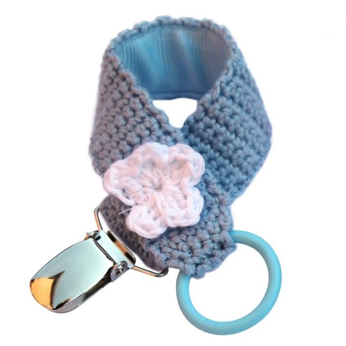 Handvirkad napphållare i ljusblå med vit blomma. Håller effektivt nappen på plats, så att den inte ramlar ner på golvet eller försvinner på promenaden.Klämman fäster man i barnets tröja eller jacka. Tvättas i handen eller i tvättpåsa i maskin vid max. 30 grAv säkerhetsskäl, finns det ett band påsystt på baksidan, så napphållaren bevarar måttet efter tvätt.Bandet är i matchande färg.Rekommenderat ålder: NyföddProdukten är godkänd enl. standard EB12586:2007+A1:2011 Släng napphållaren vid första tecken på slitage