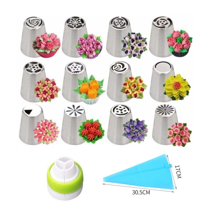 Ett set till att göra blomdekorationer med. I paketet ingår:12st stora blomtyllar/bladtyllar1st stor koppling som man kan blanda 3 färger1st spritspåse i silikon. Storlek 17x30cm