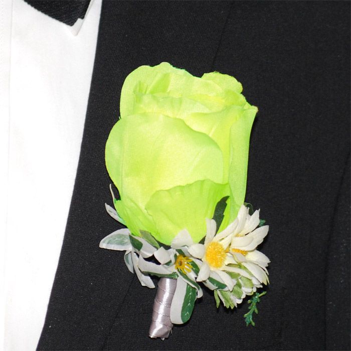 Corsage föreställande en ros i ljusgrön färg med små prästkragar runt. Total höjd 12.5cm.Fästes med färdigmonterad säkerhetsnål eller klämma. Klämman kan användas för att fästa produkten på både kavajen eller i t.ex. en håruppsättning.