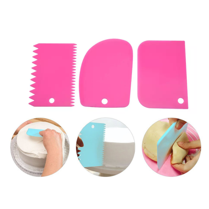 En bra hjälpreda under bullbaket eller till tårtan. Använd skrapan till att dela på degen och för att skrapa bort rester från arbetsbänken när du är klar. Används också till icing, smörkräm och frosting som gör att du enkelt får fina, släta tårtor. Vill du ha mönster så använd den taggiga skrapan.Mått ca 8,5cm x 12cmMaterial plast.