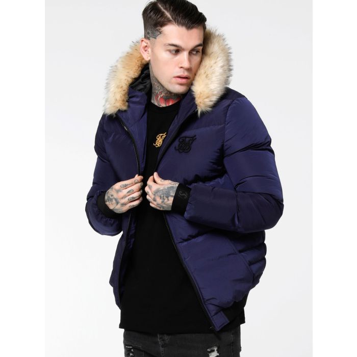 Navyblå jacka från Sik Silk. Broderad logotyp på bröstet. Fickor för händerna med knäppning. Mindre ficka på ena ärmen med zipper och Sik Silk-hangtag. Avtagbar fuskpäls. Normala i storlek men något åt det mindre hållet.