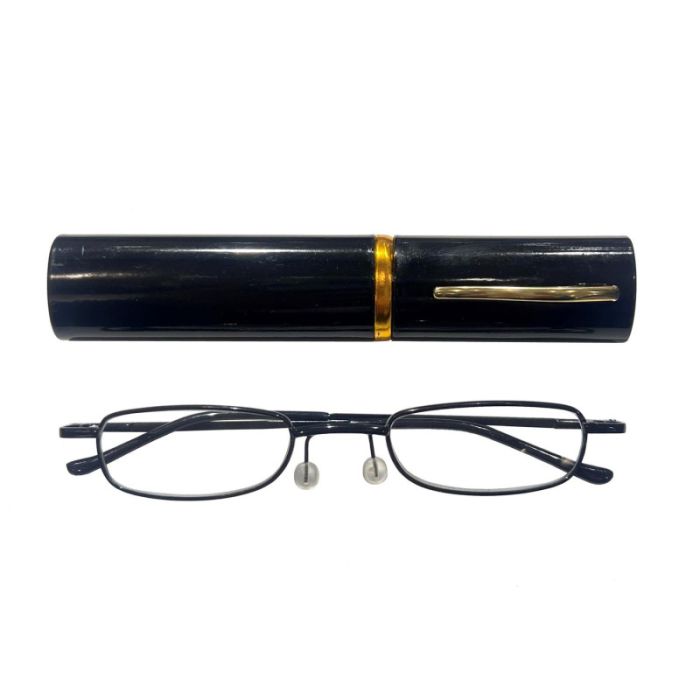 Glasögon i praktiskt och hållbart fodral, finns i olika styrkor från 1.0 till 3.5.