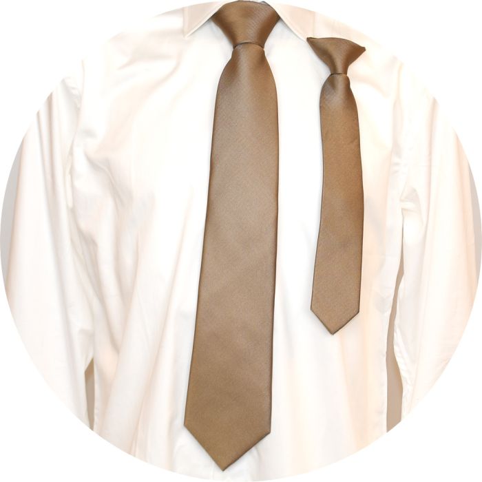 En till far och en till sonen. Knäppfäste på barnslipsen. Vävd siden. Moccabrun. Slipsbredd 85 mm eller 60 mm på vuxenslipsen. På bilden syns 85 mm. Barnslipsen passar till barn i ålder ca 1,5-7 år. Äldre barn väljer med fördel den smalare vuxenslipsen.