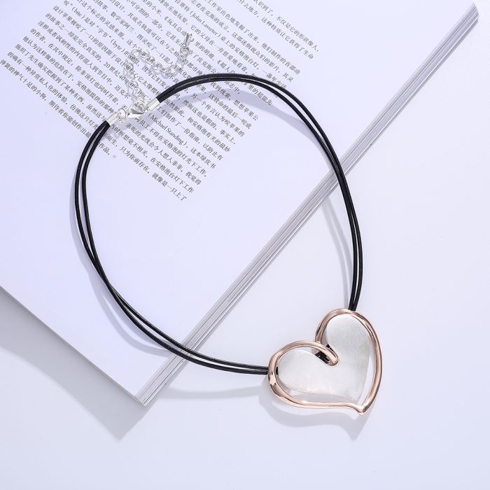 Halsband med borstad silverfinish och två korta läderband. Smycket består av två stycken hjärtan ett silvrigt och ett tunnare i roseguld som omsluter själva hjärtat i mitten. Dess sagolikt vackra design ger det en modern och stilsäker look. Halsbandet är både elegant men samtidigt chict och vi skulle vilja påstå att det passar till allt. Det är en unik accessoar som kommer att lysa upp din outfit. Det är ett utmärkt val för dig som söker ett trendigt smycke som kommer att skapa ett starkt intryck och dra blickarna till sig. Halsbandet ligger snyggt runt halsen och är lätt att kombinera med dina övriga accessoarer. Halsbandet är försett med en förlängningskedja och går att justera ca åtta centimeter. Våra smycken levereras i en smyckespåse alternativt presentförpackning i fall du önskar ge bort det i present.