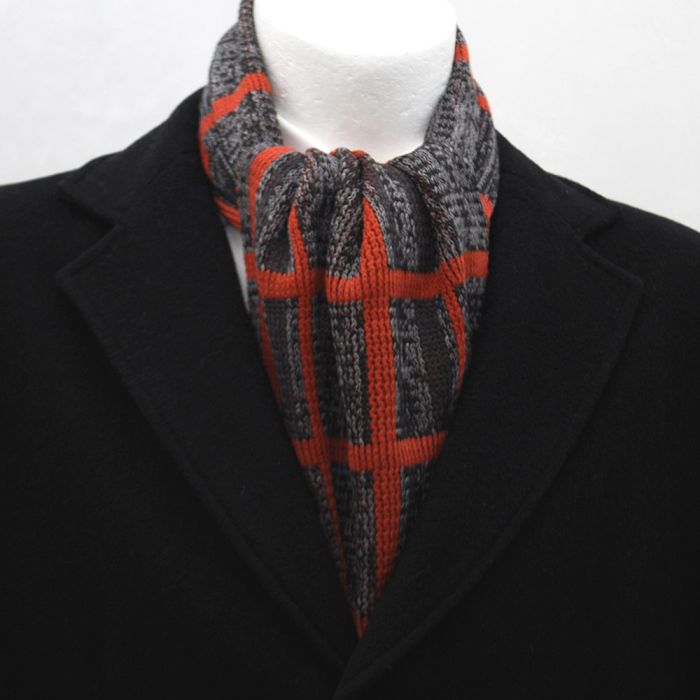 Halsduk i 100% acryl. Rutig i färgerna mörkorange och nyanser av grå. Mått på halsduken är 26x 174 cm exklusive frans totallängd med fransar 188 cm. .