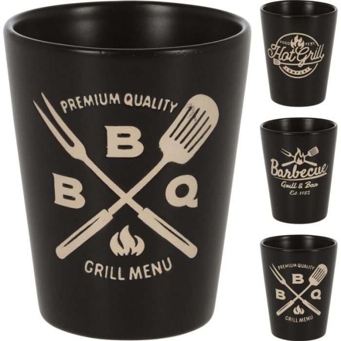 Trevlig mugg i svart keramik med "grilltema". Rolig att ge bort till någon som verkligen gillar att grilla och laga mat, kan användas som vanlig mugg till kaffe eller te men också när du blandar marinader osv. Kommer i en 3-pack med en av varje motiv.