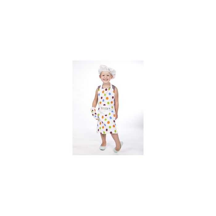 Förkläde till stjärnbagaren eller till den lilla kocken.I dessa kläder kan man baka bullar eller göra go mat.Förklädet har en praktisk ficka på magen. Mössan är med gummiband och det finns även en grytvante med, för att man inte skall bränna sig.Storleken passar från 3-6 år.Maskintvättas på 40°C.