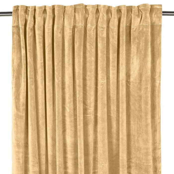 En sammetsgardin med en lätt glansig yta som ger dem ett tidlöst och sofistikerat utseende. Gardinens fall är mjukt och naturligt, formad av tyngden och tygets karaktär. Sammet kan skapa en känsla av både lyx och ombonat.