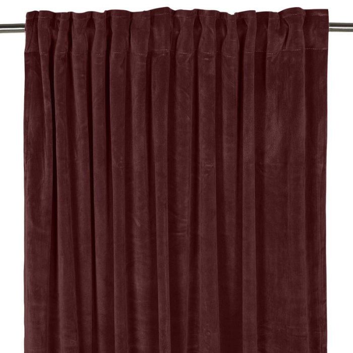 En sammetsgardin med en lätt glansig yta som ger dem ett tidlöst och sofistikerat utseende. Gardinens fall är mjukt och naturligt, formad av tyngden och tygets karaktär. Sammet kan skapa en känsla av både lyx och ombonat.