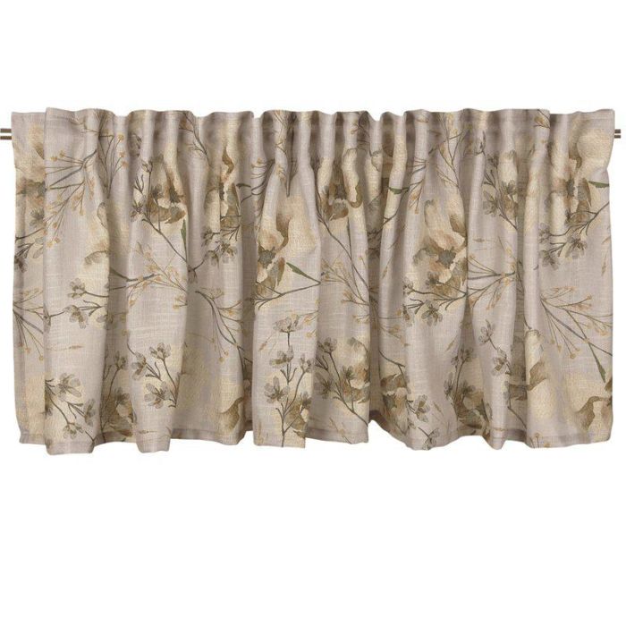 Gardinkappa tillverkad i polyester med ett storblommigt digitaltryckt mönster. Slubeffekten i tyget ger kappan en härlig livfull struktur. Kappan har ett påsytt multiband och kan hängas upp med rynkbandskrokar, fingerkrokar, kanal samt dold hälla.