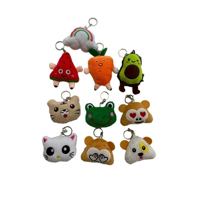 Roliga nyckelringar i mjukismaterial. Kommer i 10 olika motiv - Regnbåge, Vattenmelon, Morot, Avokado, Brun katt, Groda, Apa, Vit katt, "Ser inte" eller Hund.