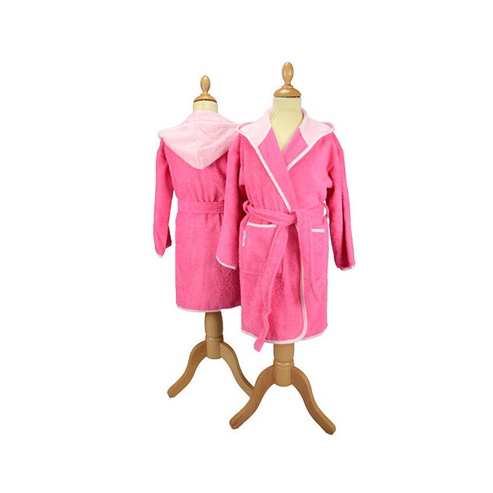 Mysig och stilren barnbadrock i pink frotté med rosa detaljer – perfekt efter bad, dusch eller under lugna morgnar hemma. Den mjuka, absorberande frottén håller barnet varmt och bekvämt, medan den praktiska huvan ger extra skydd mot kyla. Badrocken har två fickor framtill och ett midjebälte som enkelt knyts för att sitta säkert på plats. Den kontrasterande ljusblå kanten ger badrocken ett lekfullt men samtidigt klassiskt utseende som passar både flickor och pojkar.Ett idealiskt val för både vardag och mysiga stunder, oavsett om det är efter simhallen eller under en lugn helgfrukost. Finns i flera storlekar för att passa både små och lite större barn.Tvättråd: 40℃