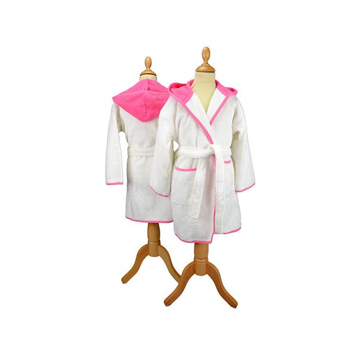 Mysig och stilren barnbadrock i vit frotté med pink detaljer – perfekt efter bad, dusch eller under lugna morgnar hemma. Den mjuka, absorberande frottén håller barnet varmt och bekvämt, medan den praktiska huvan ger extra skydd mot kyla. Badrocken har två fickor framtill och ett midjebälte som enkelt knyts för att sitta säkert på plats. Den kontrasterande ljusblå kanten ger badrocken ett lekfullt men samtidigt klassiskt utseende som passar både flickor och pojkar.Gör badrocken personlig med barnets namn broderat i vacker tråd – en omtänksam och unik present till födelsedagar, dop eller andra speciella tillfällen. Den perfekta kombinationen av funktion, komfort och personlig touch.Ett idealiskt val för både vardag och mysiga stunder, oavsett om det är efter simhallen eller under en lugn helgfrukost. Finns i flera storlekar för att passa både små och lite större barn.Tvättråd: 40℃