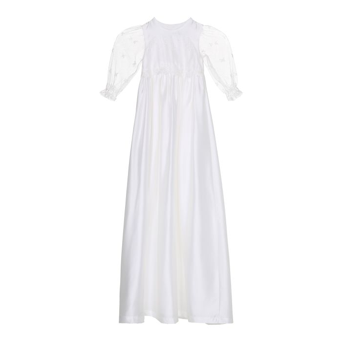 Dopklänning i satin från Jocko. Dopklänningen är långärmad och har genomskinliga spetsarmar. På bröstet är det ett fint spetsmönster även nertill på ärmslut är det spets. Bak har den knappknäppning som gör den enkel att klä av och på barnet. Hel klänning. Storlek/längd 105 cm. Omkrets bröst 48 cm. Längd på ärm 26 cm. Passar barn 3 - 12 månader. Färg vit.Material på klänningen 100% polyester och underkjolen 100% bomull.