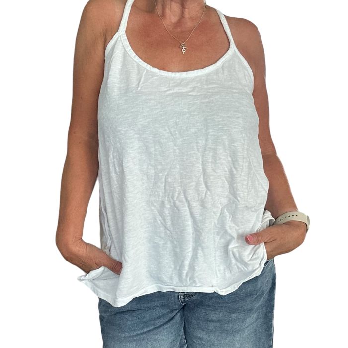 Snyggt linne med smala band och brottarrygg. Linnet är lätt a-linjeformat och har rund halsringning. Bomull