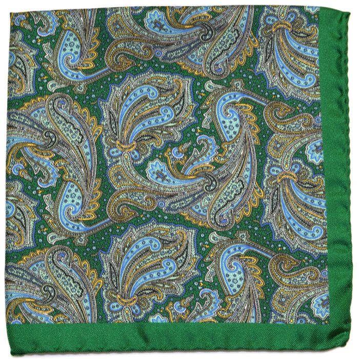 Bröstnäsduk i italiensk siden. Paisleymönster i grönt med inslag av blått och gult. Grön kant runt näsduken.Material: 100% siden.Mått: 32*32 cm.