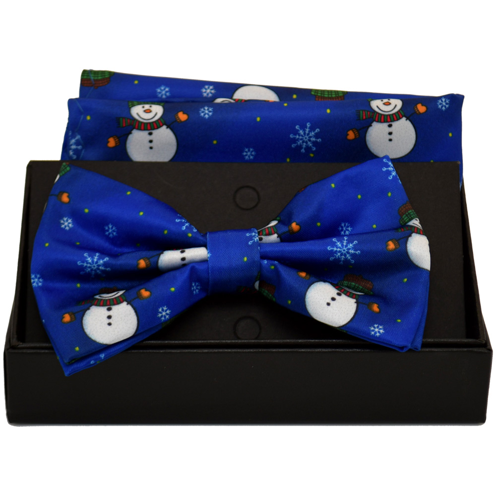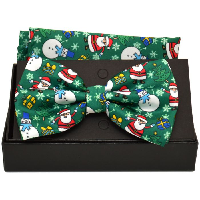 Julfluga med matchande näsduk. Tomtar och snögubbar på grön julmotiv botten.Material: 100% polyesterStorlek: Fluga 12x6.5 cm. Näsduk 25x25 cm.