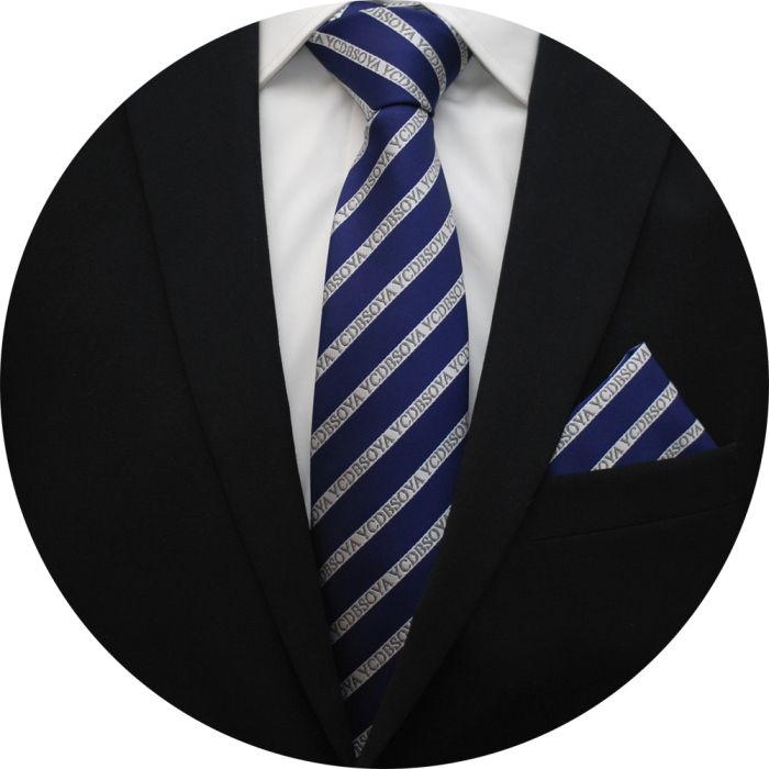 Slips med matchande näsduk i polyester. Marinblå botten med bokstäverna YCDBSOYA i silver som står för You Can´t Do Business Sitting On Your Ass. Slipsbredd 60mm eller 85 mm. Bredd 85 mm på bilden. Se bild 2 för bröstnäsduk.