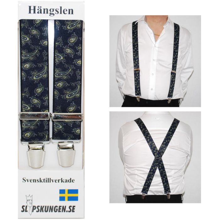 Svensktillverkade 35 mm breda hängslen. Paisleymönster på marinblå botten. Längd 120 cm. X-rygg. Silverfärgade knäppen. Märke Slipskungen.