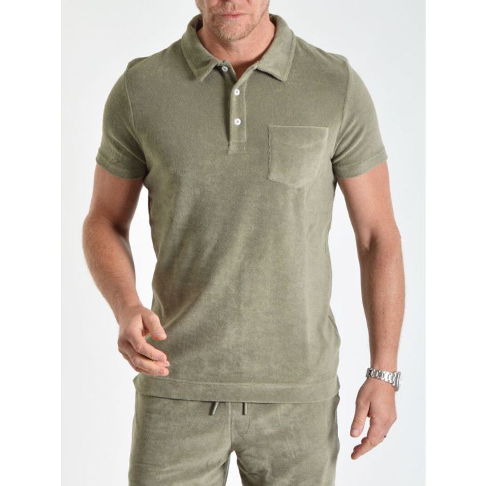 Khakigrön piké från Robbie Moor. Med lagom stor krage och tre knappar i halsen. Tillverkad i skönt frottématerial. Bröstficka och liten slits nedtill. Normala storlekar. Matchande shorts här! (På bild 187cm/87kg och strl L)