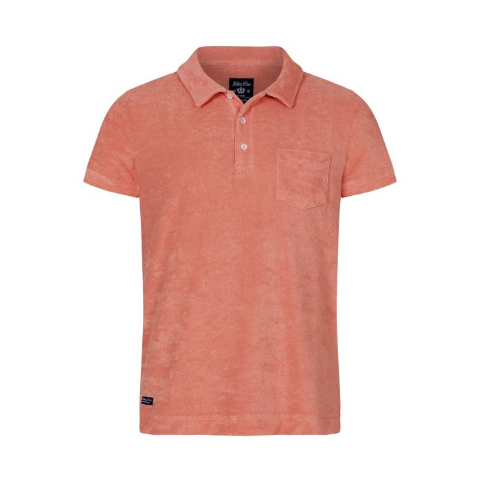 Ljust korallröd piké i frotté från Robbie Moor. Med lagom stor krage och tre knappar i halsen. Tillverkad i skönt frottématerial. Bröstficka och liten slits nedtill. Normala storlekar. Matchande shorts här! (På bild 187cm/87kg och strl L)