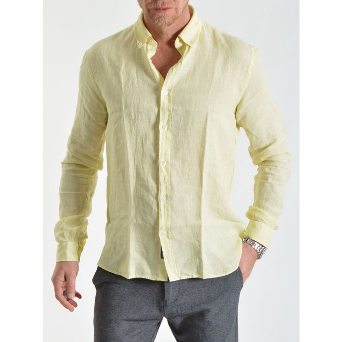 Somrigt ljusgul linneskjorta från Robbie Moor. Linneskjortan är sval och skön att ha på sig och ger ett casual men välklätt intryck. Med buttondown-krage. Normala storlekar. (På bild 187cm/87kg och strl L)