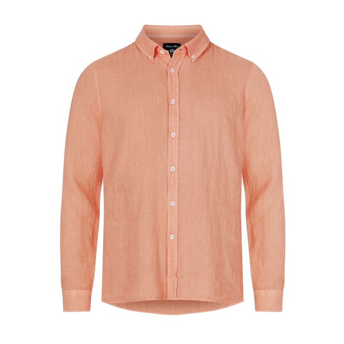 Orangeröd linneskjorta från Robbie Moor. Linneskjortan är sval och skön att ha på sig och ger ett casual men välklätt intryck. Med buttondown-krage. Normala storlekar.