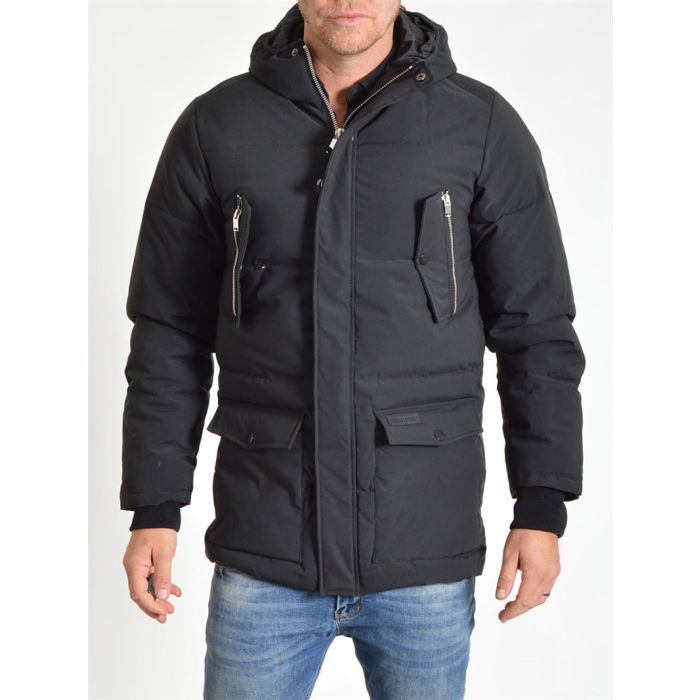 Svart parka från franska Sixth June. Skal i ett tekniskt material som gör den tålig och vattenavvisande. Hög kvalitetskänsla med snygga men diskreta detaljer. Bröstfickor med dragkedjestängning och mjukt, varmt foder, fuskfickor med knapp framför. Fickor nedtill för händerna med knappknäppning. Normala storlekar men åt det smalare hållet. Värme 4/5.