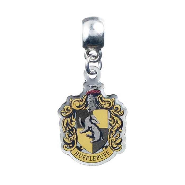 Berlock i form av elevhemmet Hufflepuffs vapensköld med grävlingen och gula detaljer. Smycket är fäst på en silverpläterad ögla.