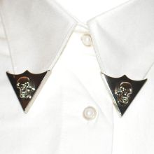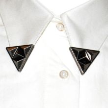 Kragändar med döskalle.Fästs på kragen med 1 pinhållare. Se hållare bild 3. Triangelformad.Färg: Mörkoxiderad metall.Storlek: 2,3*2,3*2,3 cm.