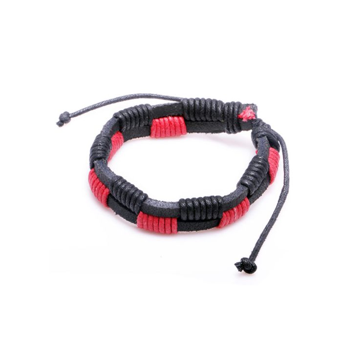 Läderarmband med inslag av bomull. Ställbart knutlås för bra passform och enkel av och påtagning. Maximal inre omkrets 24 cm. Svart och rött. Levereras i en sammetspåse.
