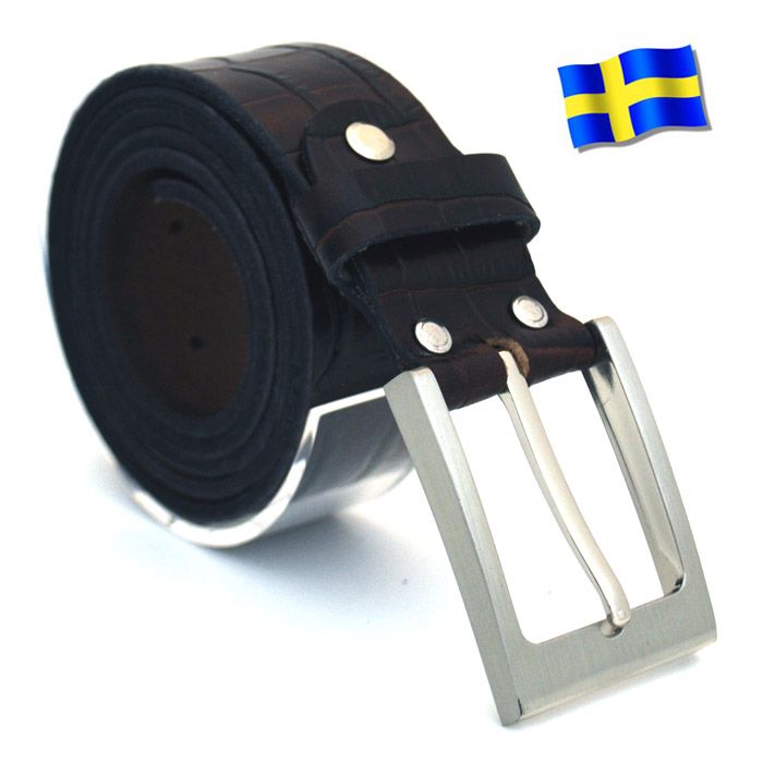 Svenskt bälte i ovanläder. Präglat koläder som ger skärpet ett tydligt krokodilmönster.Färg brun. Bältet finns i omkrets från 85-135 cm.Alla våra svenska livremmar är i ovanläder vilket ger skärpet en lång livslängd.För att förenkla för er kunder har vi infört mått i omkrets. Mät omkretsen med byxor på vid höjd där hällorna sitter.Vid köp av 2 svenska läderbälten endast 575:- och 3 st för endast 725:-. Gäller ej XL. Rabatten dras automatiskt i kassan.