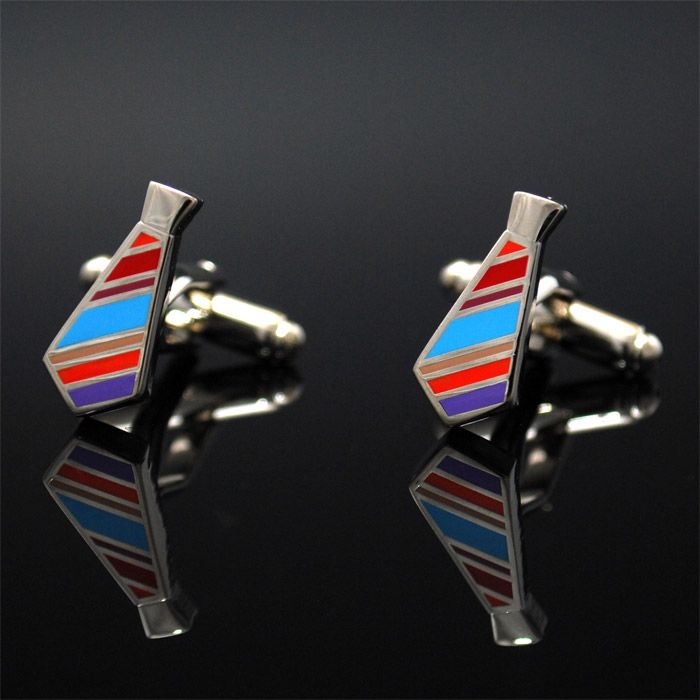 Manschettknappar föreställande slipsar i de färgglada färgerna orange, röd, turkos, beige och lila. JFB-collection. Silverpläterad mässing. Levereras som standard i sammetspåse se bild 2. Som tillval kan man välja presentask istället för sammetspåse se bild 3. Presentasken kostar 29:-.
