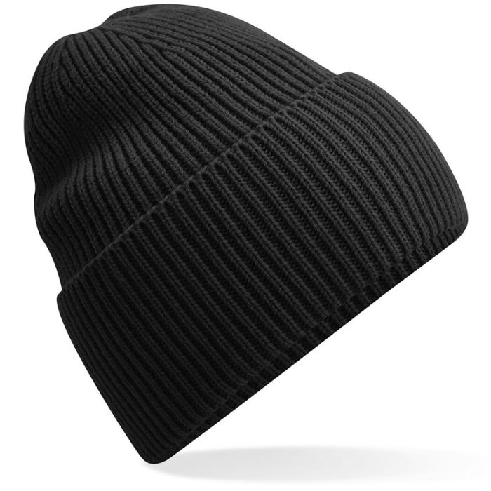 Ribbstickad mössa med uppvik. Innehåller minst 50% återvunnen polyester. Konstruerad krona för maximal komfort. Brett uppvik designad för optimal dekoration. Storlek one size.Material:52% polyester, 47% akryl, 1% elastanFärg: Svart