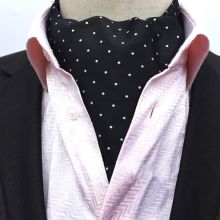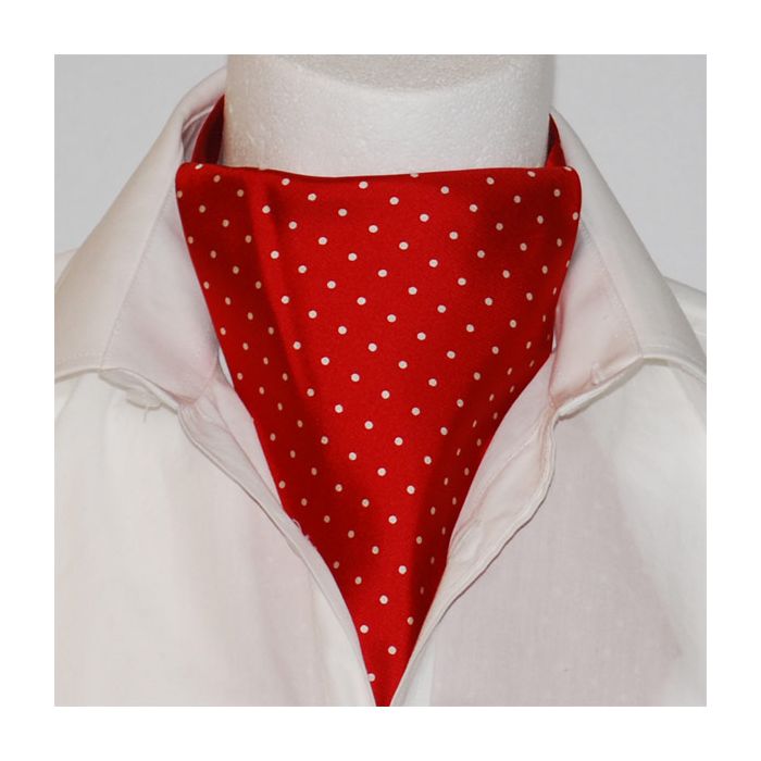 Plastrong i finaste siden. För dig som vill vara uppklädd, men vill variera dig från slipsen eller flugan. Röd basfärg med vita prickar. Se bild 2 för funktion och bild 3 för närbild på mönstret.