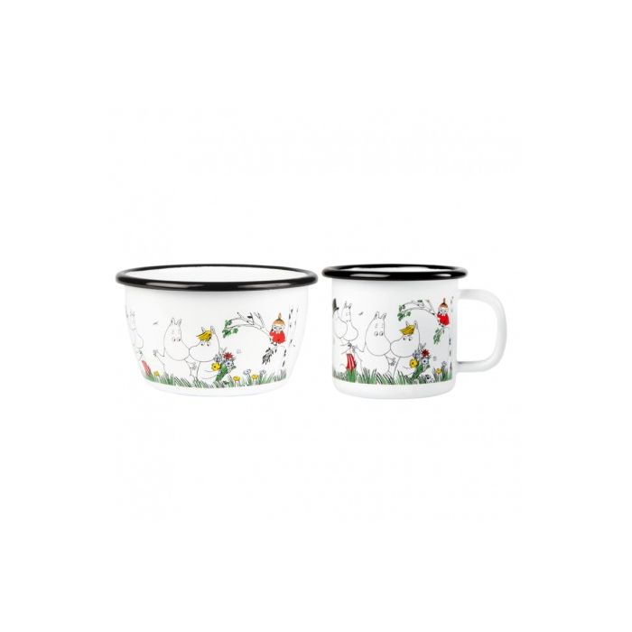 Set emaljskål 3 dl och emaljmugg 1.5 dl mumin glada familjen