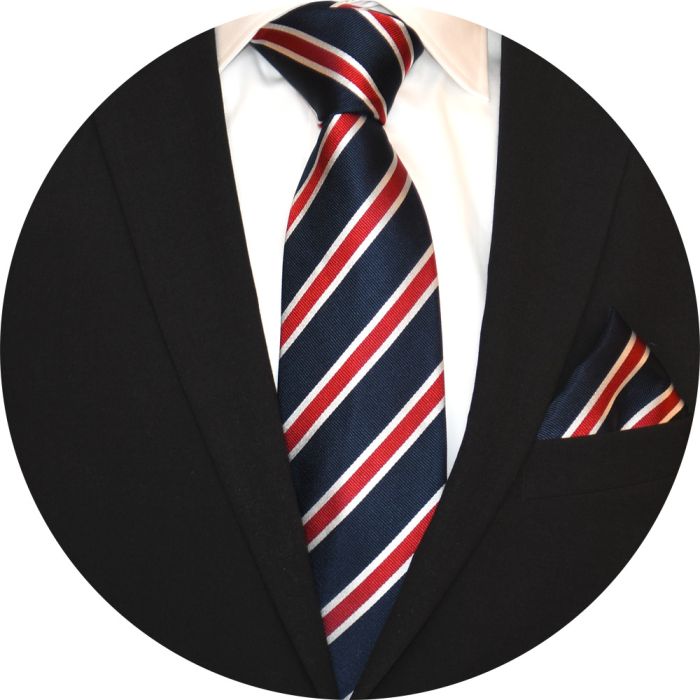Sidenslips med dito näsduk i vävd siden. Röda och vita ränder på marinblå botten. Slipsbredd 85 mm eller 60 mm. På bilden syns 85 mm. Se bild 2 för bröstnäsduk.