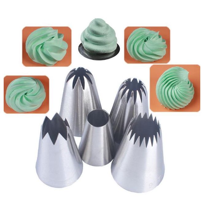 Ett set med 5 tyllar till att göra fina mönster till dina bakverk.Lite extra stora tyllar som passar perfekt till att spritsa potatismos och dylikt.Material i rostfritt stål.Storlek enligt bild